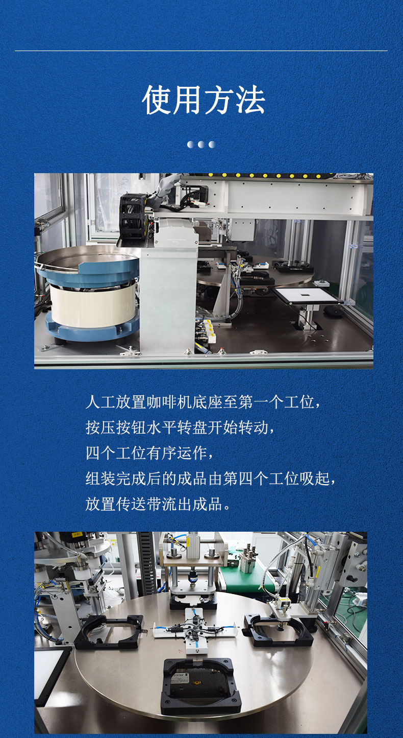 人工放置咖啡機底座至第一個工位,按壓按鈕水平轉盤開始轉動,四個工位有序運作,組裝完成后的成品由第四個工位吸起,放置傳送帶流出成品。