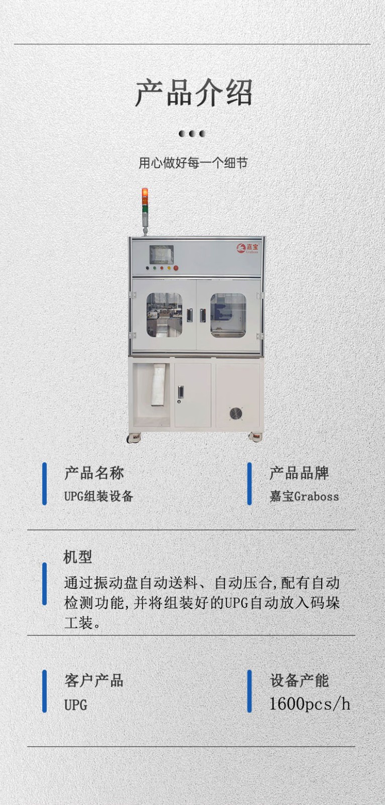 UPG自動組裝。 全程實現全自動化,并配有自動檢測功能,自動檢測是否掉落、自動檢測是否壓合、自動檢測不良品等。
