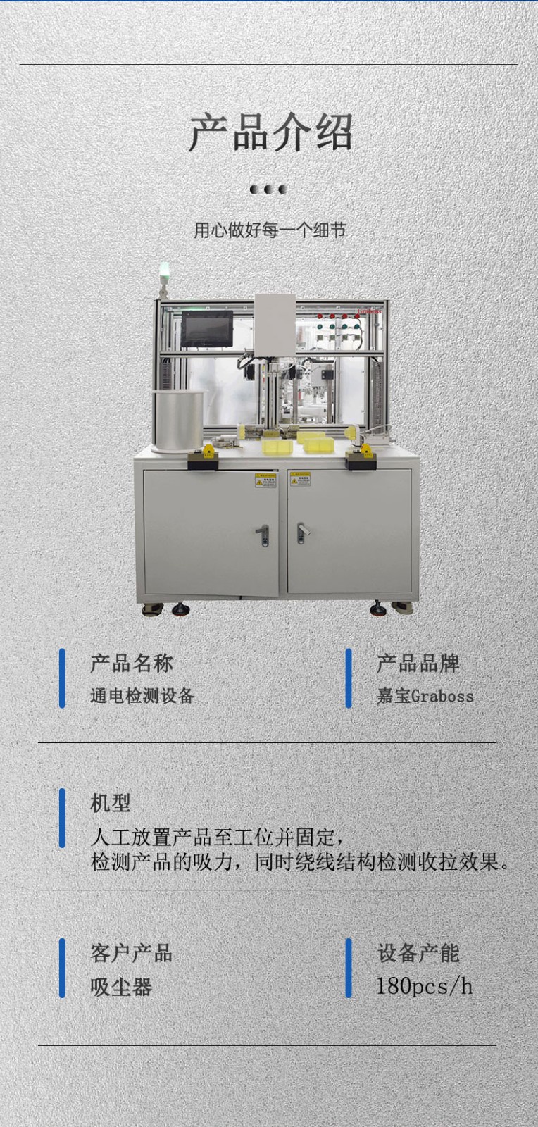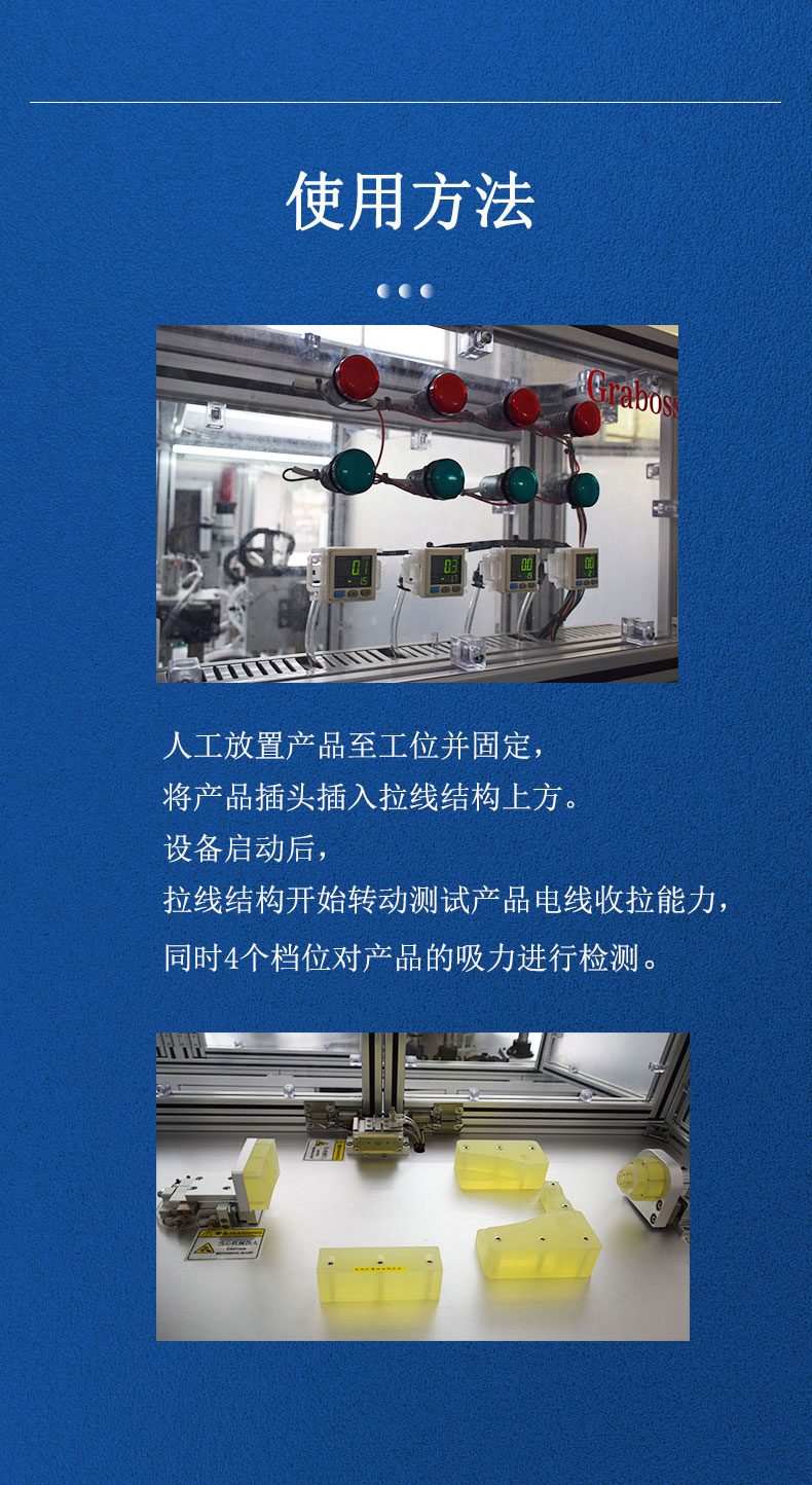 吸塵器電線收拉狀況檢測、吸力檢測。人工放置產品至工位并固定,將產品插頭插入拉線結構上方。設備啟動后,拉線結構開始轉動測試產品電線收拉能力,同時4個檔位對產品的吸力進行檢測。